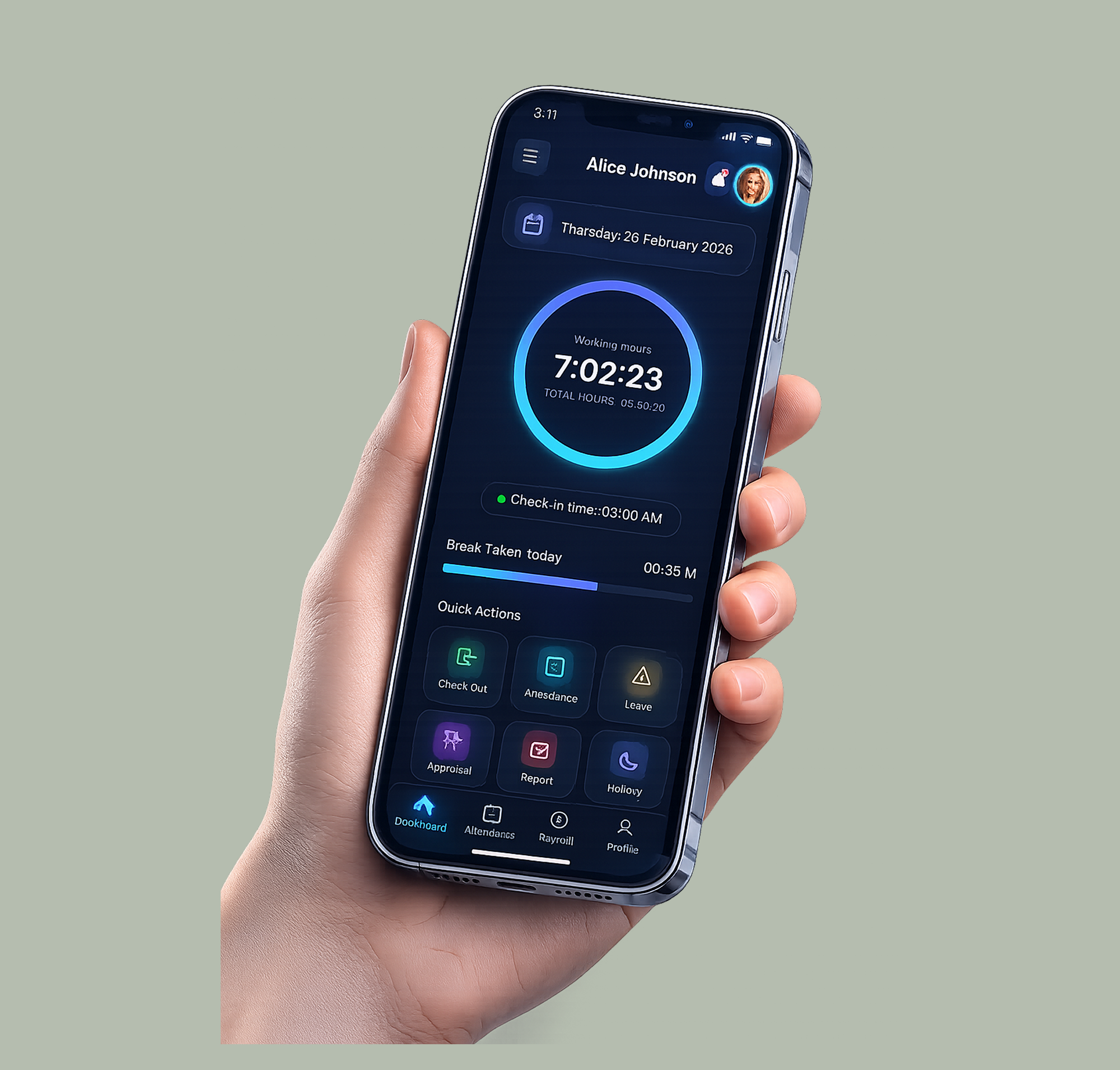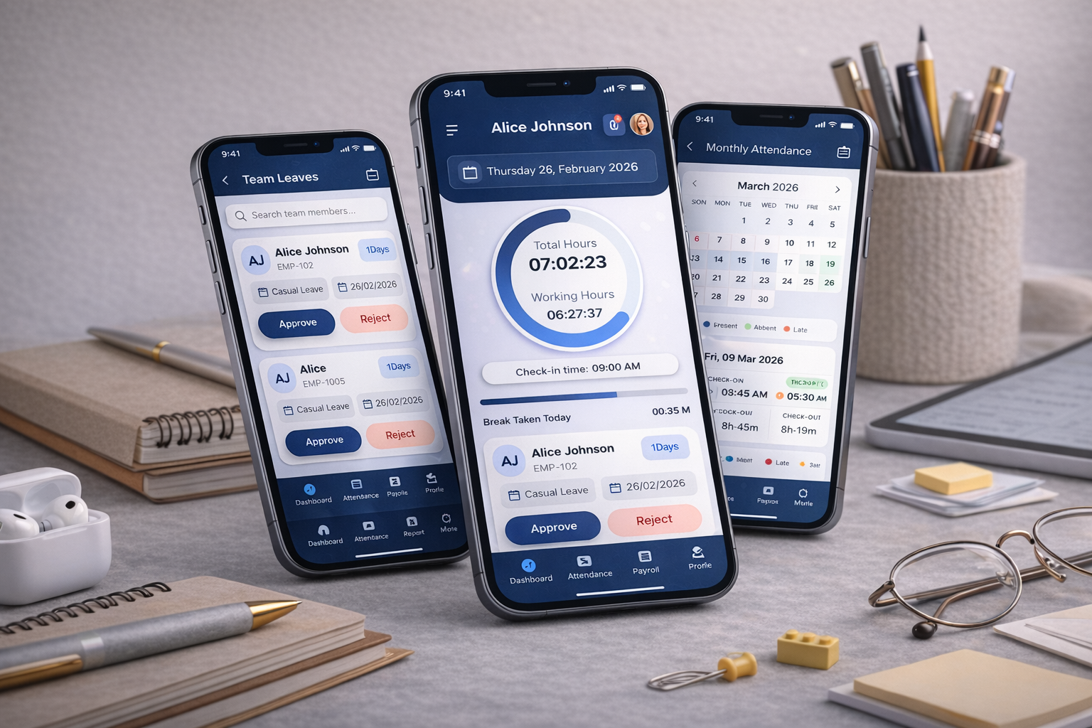 Smart HR management mobile app with attendance tracking, payroll, dashboards, and intuitive user-friendly interface design.