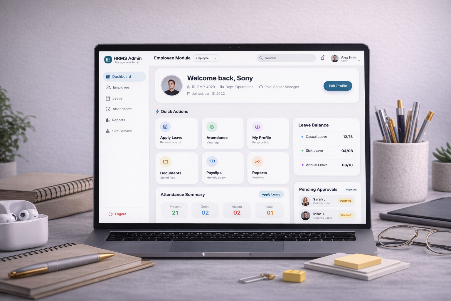 Advanced HRMS mobile app with analytics, employee management, attendance tracking, and performance monitoring features.